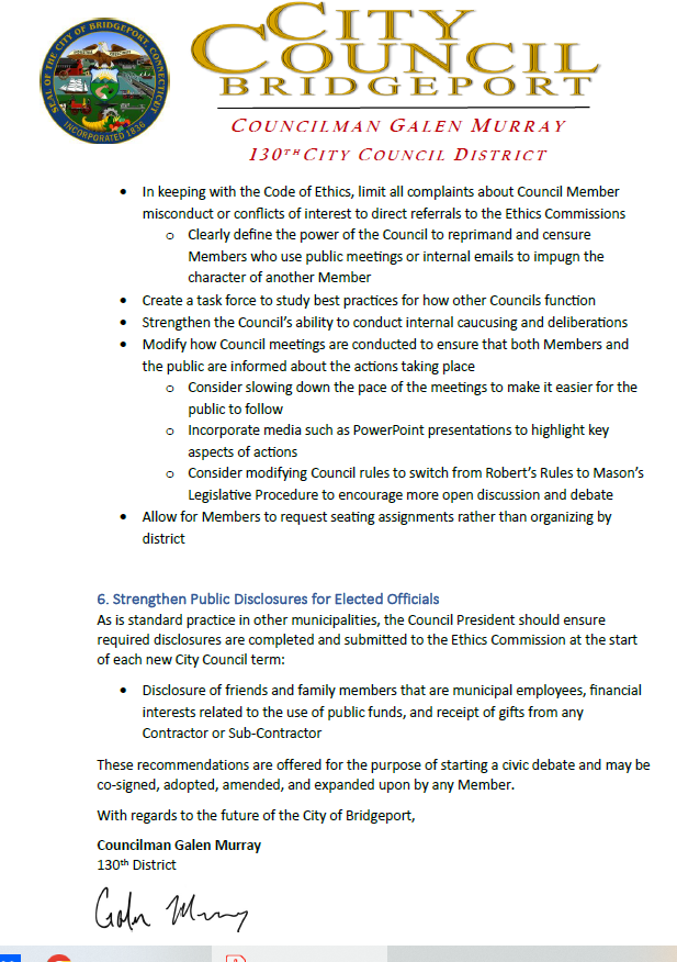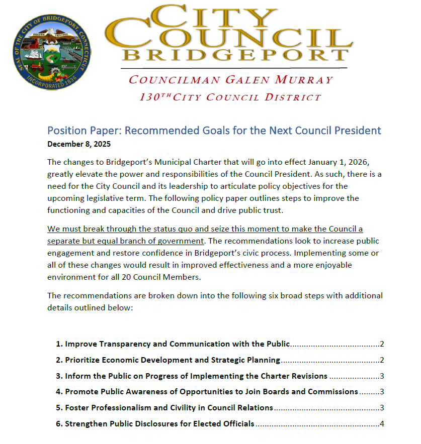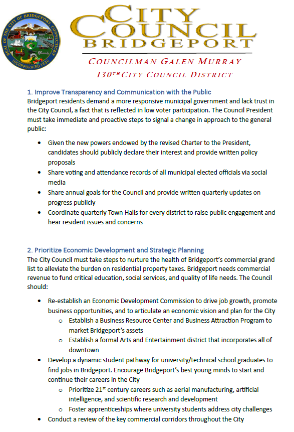 Very thoughtful, timely, valid points in a well-crafted position paper. But given the composition of the new City Council, it seems that it will be a steep, uphill battle getting the majority of the Council to forcefully push for such an agenda. Ideally, the Mayor and Council President would be out in front of such an agenda, rallying the Council to act appropriately. We can certainly hope that this happens, but I wouldn’t hold my breath — unless somehow the initiative is adopted by the press and they are able to follow it and editorialize to the point of helping to get the voters of Bridgeport to rally around it — and maybe get a real grass-roots movement to rally around it. (Generation Now? NAACP?…)