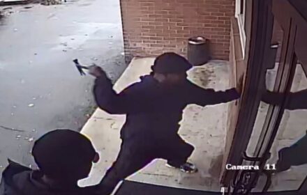 Security video shows the burglars using hammers to break out a reinforced glass door on the side of the building.
